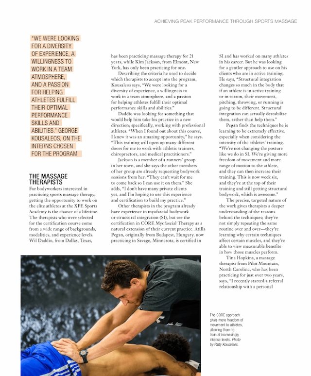 Az meghatározó volt, hogy az edző, a vezető orvos, aki ebben az esetben egy chiropractor volt, az alárendelt Strukturális Integrátor és a mindannyiukhoz tartozó menedzser (aki masszőr és személyi edző is) mindvégig szoros kapcsolatban és folyamatos kommunikációban voltak. Ennek a láncnak a végén én, mint az egyik terapeuta végeztem a dolgomat, ami egyrészt új fogások és technikák begyakorlása, másrészt a sportolókkal való munka, a kezelések adása volt.